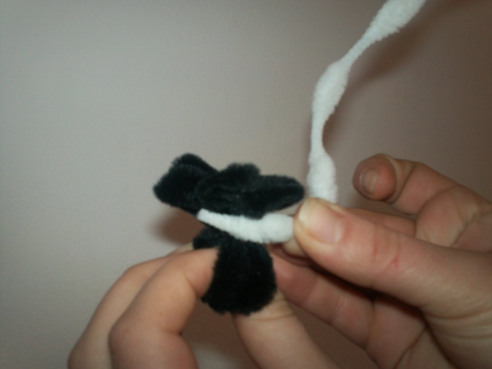 Se iau cele 3 fire de pipe cleaners negru. La jumătatea firelor se pune degetul inelar. Astfel vor fi trei capete de pipe cleaners într-o parte și alte trei în cealaltă parte. Cele 6 capete se ridică de o parte și de cealaltă a degetului, răsucindu-se apoi împreună de vreo două ori deasupra inelarului. Astfel s-a obținut forma inelului.